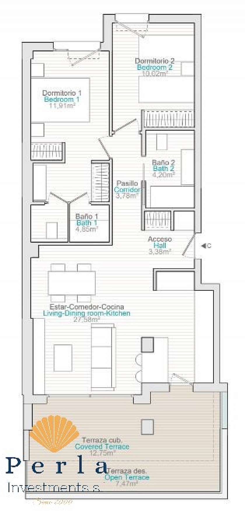 A beautiful 65,71m2 apartment on the ground floor 100 meters from the beach in an awesome residential center with 2 spacious bedrooms, 2 bathrooms with underfloor heating, a beautiful living room with a fully fitted kitchen with quality appliances, a bright living room that opens onto a 20,22 terrace