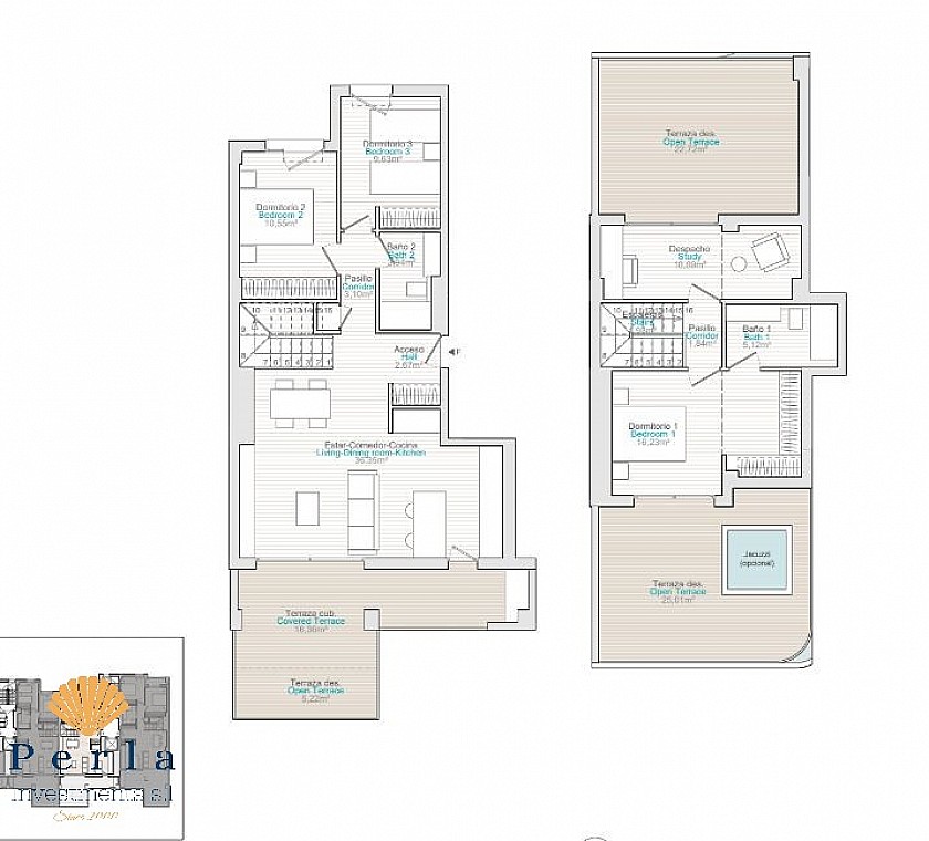 Falleg 102,05 þakíbúð 100 metrum frá ströndinni í æðislegum íbúðarkjarna með 3 rúmgóðum svefnherbergjum, 2 baðherbergjum með hita í gólfi, fallegt alrými með full innréttuðu eldhúsi með gæða heimilstækjum, bjartri stofu sem labbað er út á 21,58m2 svölum sem gengið er upp á 47,73m2 þaksvalir.
