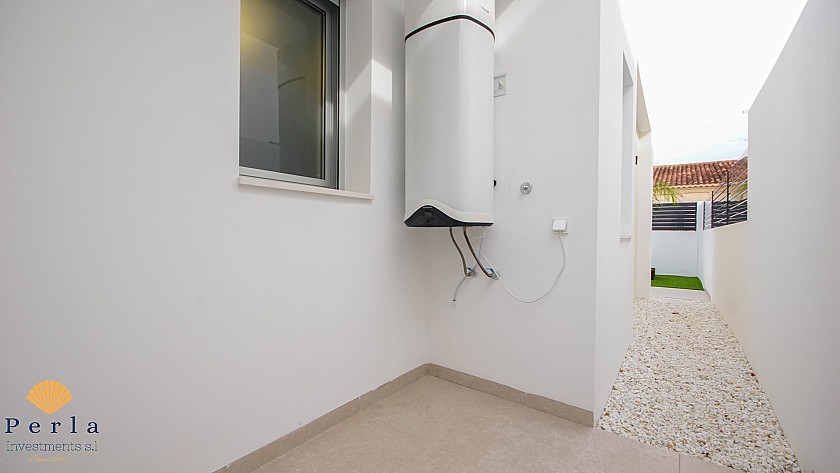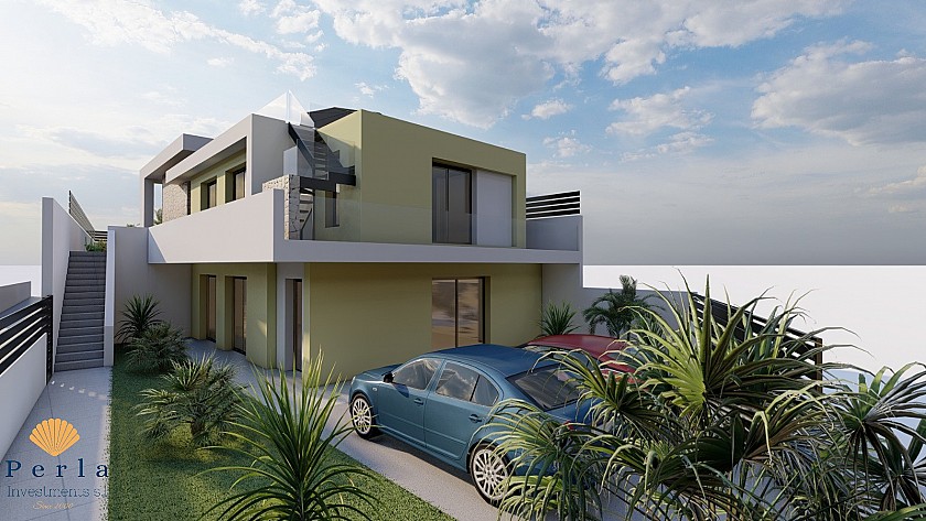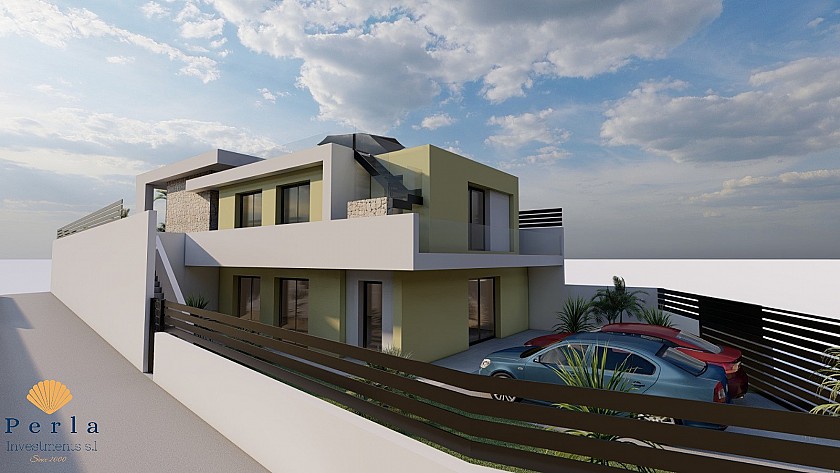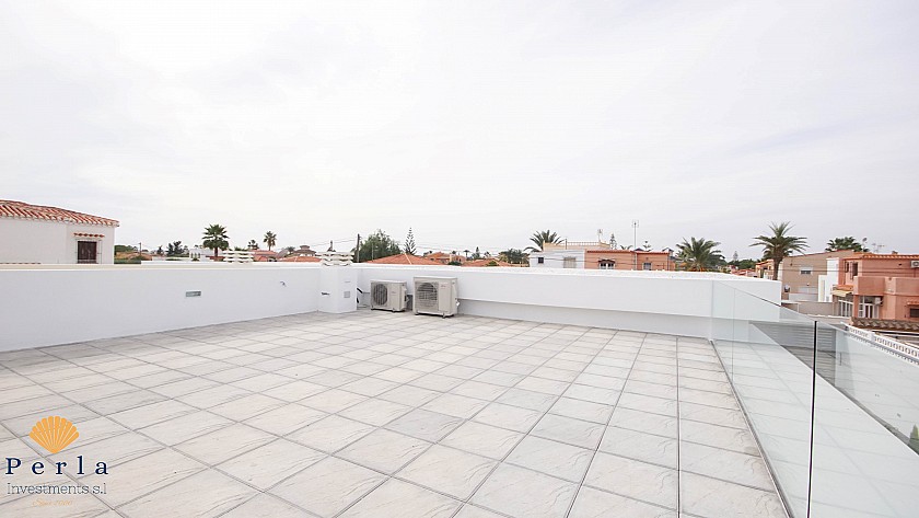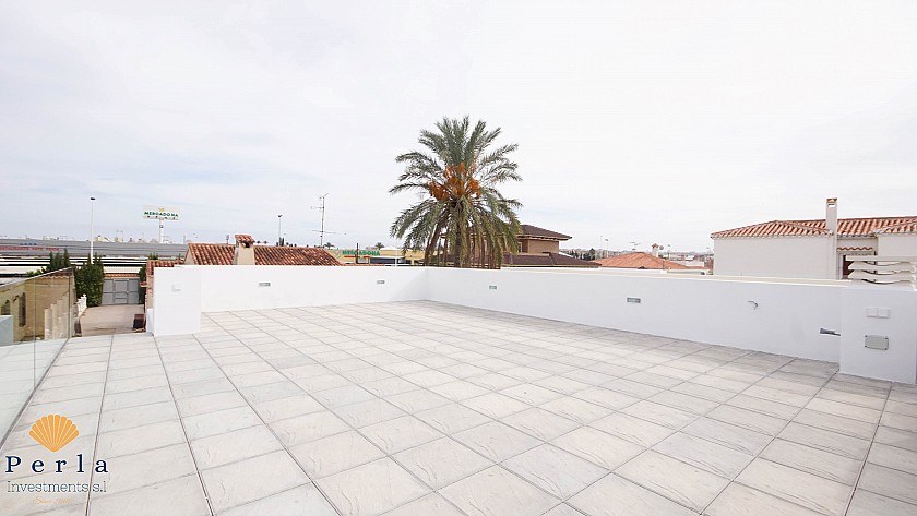 Eignin sem er 145 m2 a innan, á 400m2 lóð er með 3 svefnherbergjum, 2 baðherbergjum, bílastæði og þaksvölum með útsýni yfir Torrevieja, saltvötn og til sjávar.